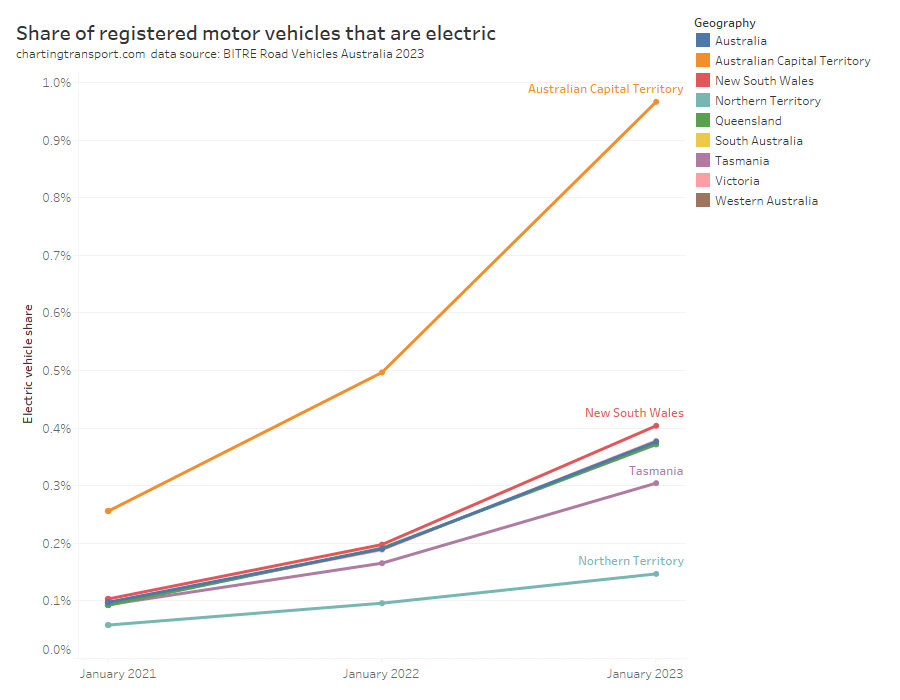 The almost entirely urban Australian Capital Territory is leading the country in electric vehicle adoption, while the Northern Territory is the laggard.