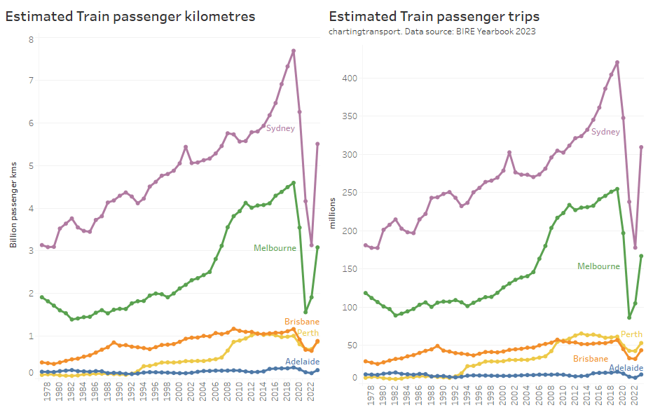 Here’s a chart showing estimates of annual train passenger kilometres and trips.