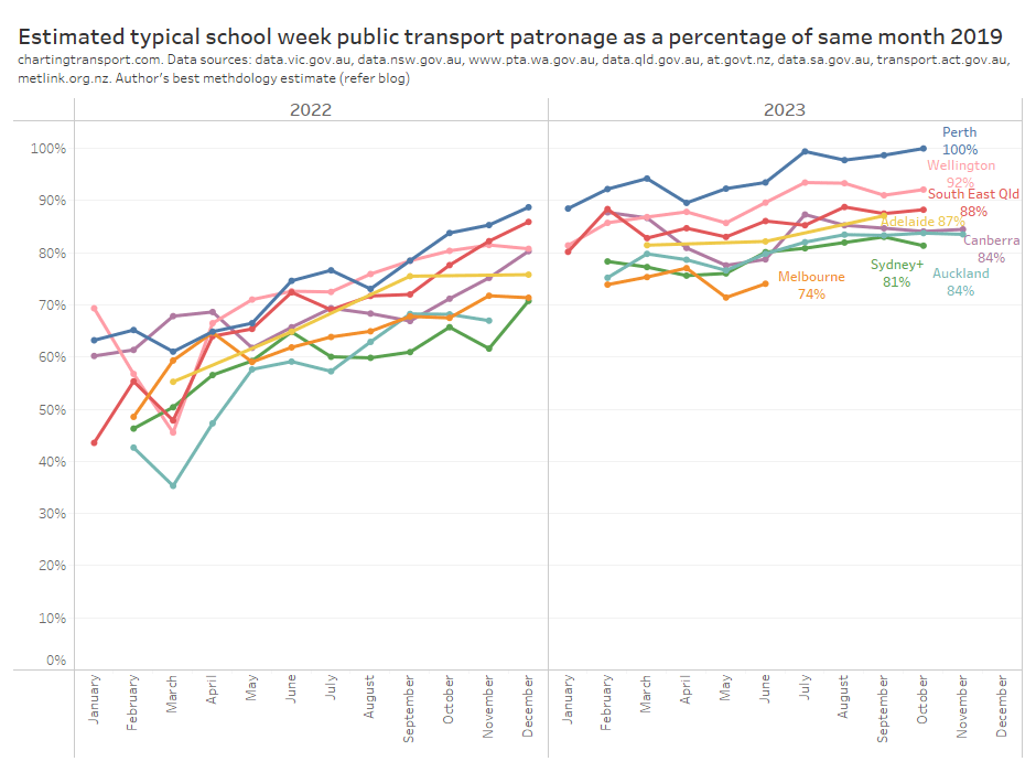 Perth seems to be consistently leading Australian and New Zealand cities on patronage recovery, while Melbourne appears to be the laggard in both patronage recovery and timely reporting. For more discussion and details around these trends see How is public transport patronage recovering after the pandemic in Australian and New Zealand cities?.