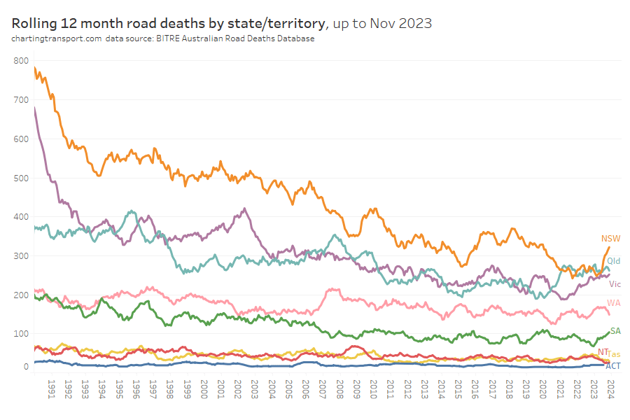 In recent months there has been an uptick in road deaths in NSW and SA. Victorian road deaths dropped during the pandemic but are back to pre-pandemic levels.