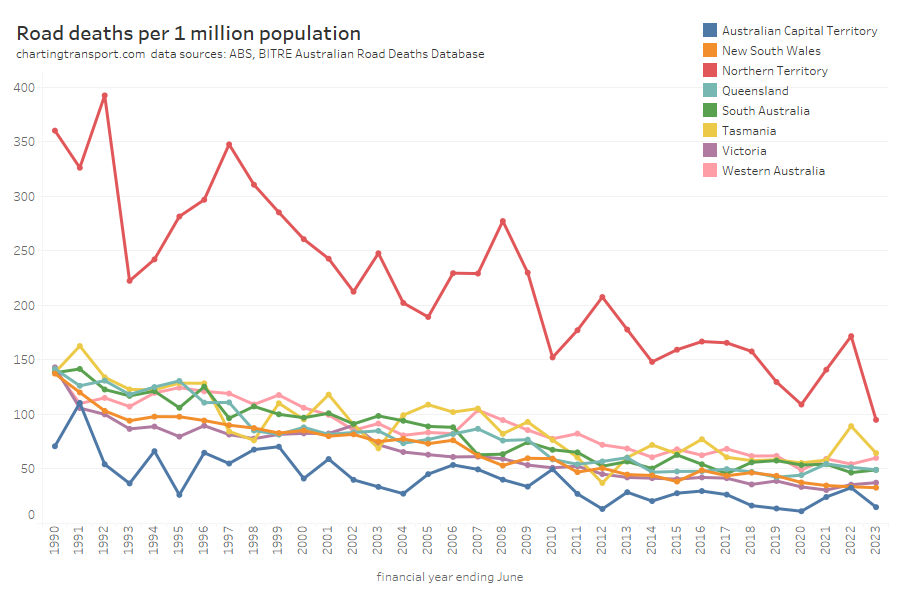 It’s hard to compare total deaths between states with very different populations, so here are road deaths per capita, for financial years: