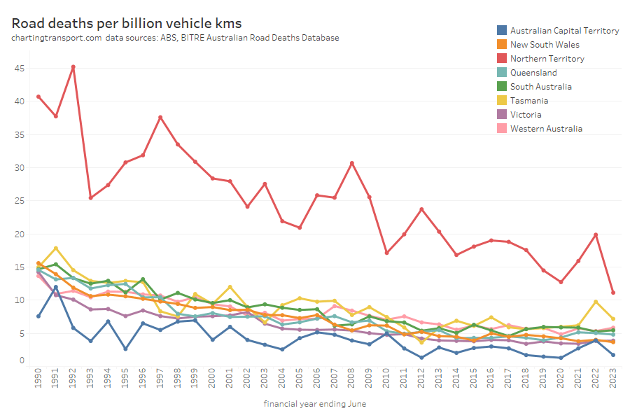 There is naturally more noise in this data for the smaller states and territories as the discrete number of trips in these geographies is small. The sparsely populated Northern Territory has the highest death rate, while the almost entirely urban ACT has the lowest death rate.
