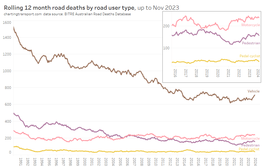 Vehicle occupant fatalities were trending down until around 2020. Motorcyclist fatalities have been relatively flat for a long time but have risen slightly since 2021.