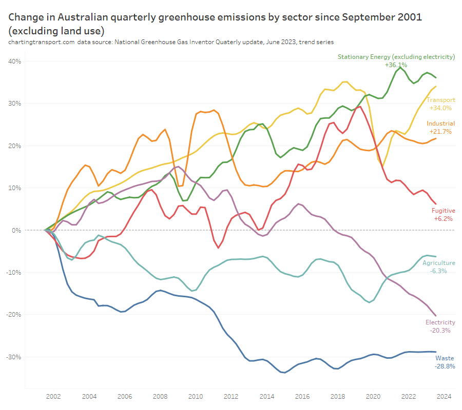 You can see that Australia’s total emissions excluding land use have actually increased since 2001. Emissions reductions in the electricity sector have been offset by increases in other sectors, including transport.