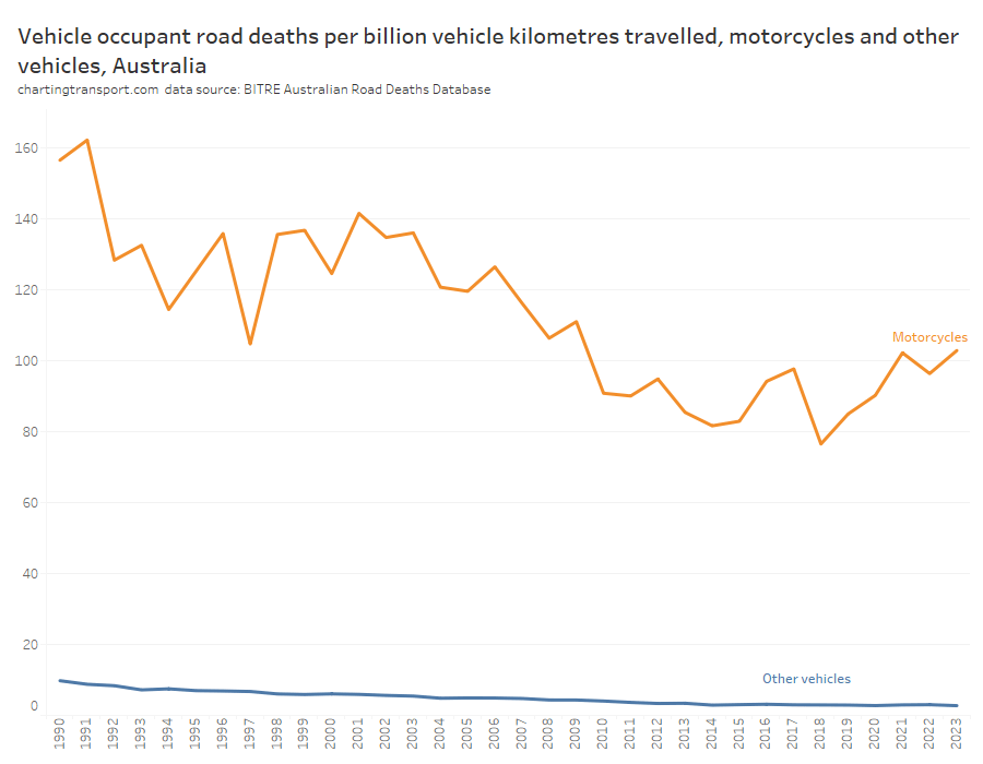 The death rate for motorcycle riders and passengers per motorcycle kilometre was 38 times higher than other vehicle types in 2022-23. The good news is that the death rate for other vehicles has dropped from 9.8 in 1989-90 to 2.7 in 2022-23. The death rate for motorcycles was trending down from 1991 to around 2015 but has since risen again in recent years.