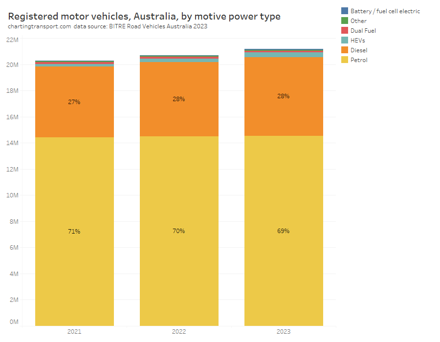 Thankfully BITRE has picked up after the ABS terminated it’s Motor Vehicle Census, and are now producing a new annual report Motor Vehicle Australia. They’ve tried to replicate the ABS methodology, but inevitably have come up with slightly different numbers in different states for different vehicle types for 2021 (particularly Tasmania). So the following chart shows two values for January 2021 – both the ABS and BITRE figures so you can see the reset more clearly. I suggest focus on the gradient of the lines between surveys and try to ignore the step change in 2021.