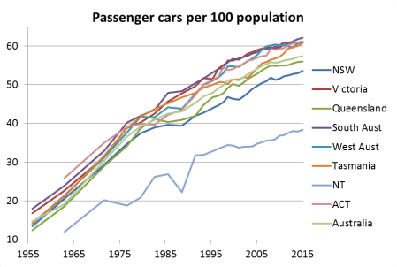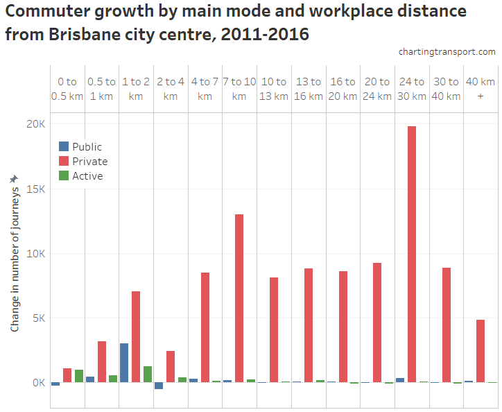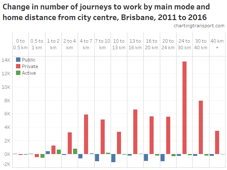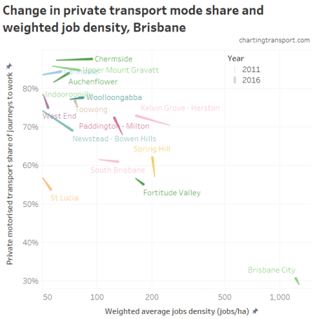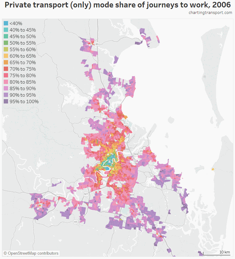 Again, there’s a very strong relationship between distance from the CBD and private transport mode share.
