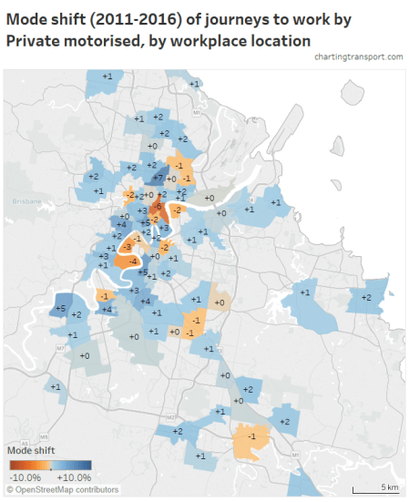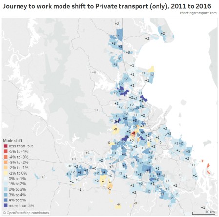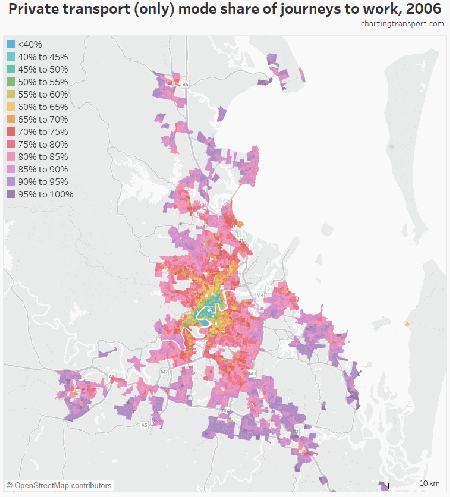 Here’s a map of private transport mode share of non-walking trips by SA2 destination: