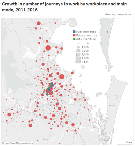 Technical note: I have set the threshold at 40 trips per SA2, but most SA2s have hundreds of surveyed trips. The grey areas of the map are SA2s with fewer than 40 trips, and/or destination zones with no surveyed trips.