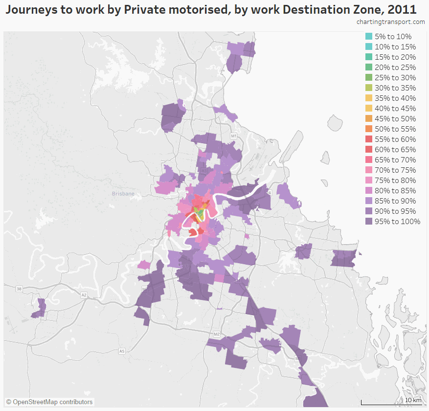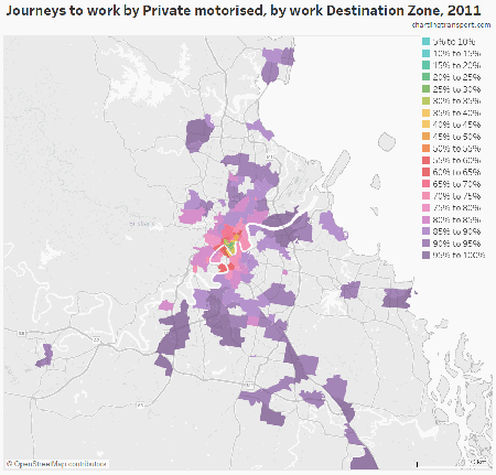 The other part of this analysis is around private transport mode shares for destinations. As usual I define private transport as a trip that involved some motorised transport, but not any modes of public transport.