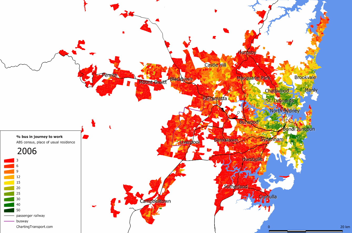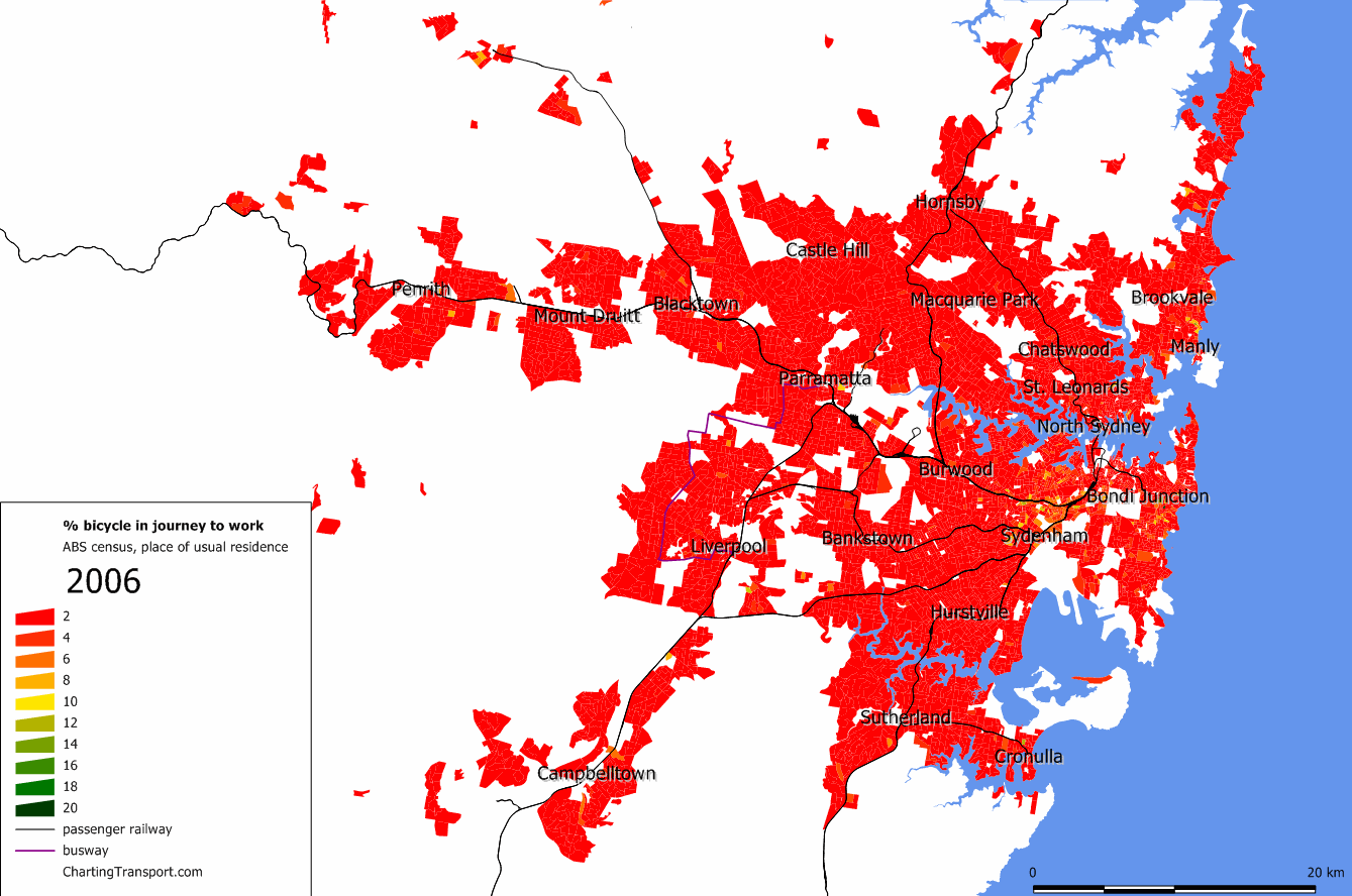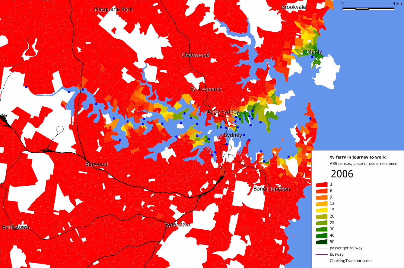 You can see that many of the grid cells that include significant amounts of water show a lower density, when it fact the population of those cells are contained within the non-water parts of the grid cell. The more watery cells, the lower the calculated density. This is could count against a city like Sydney with a large harbour.