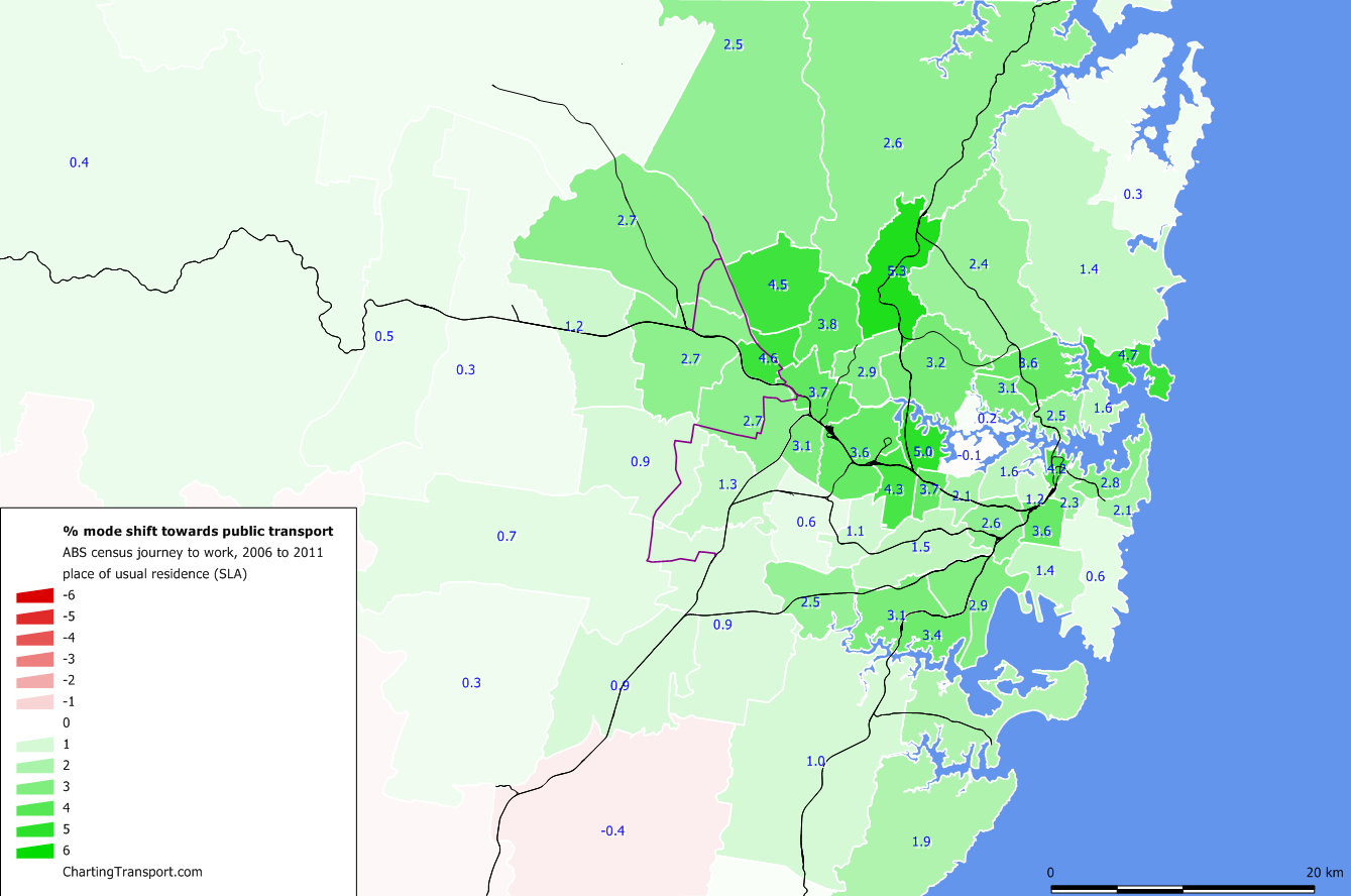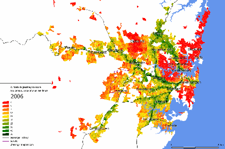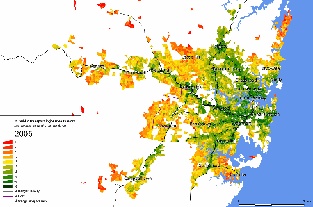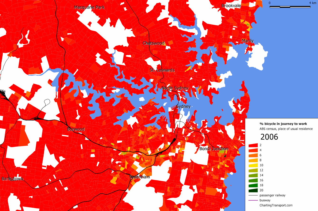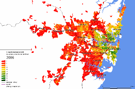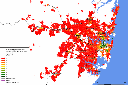 Some measures of density exclude all non-residential land, but the square kilometre grid approach means that partially populated grid parcels are counted, and many of these parcels will include non-residential land, and possibly even large amounts of water. It’s not perfect, particularly for cities with small footprints. For example, here is a density map around Sydney harbour (where light green is lower density, dark green is medium density and red is higher density):