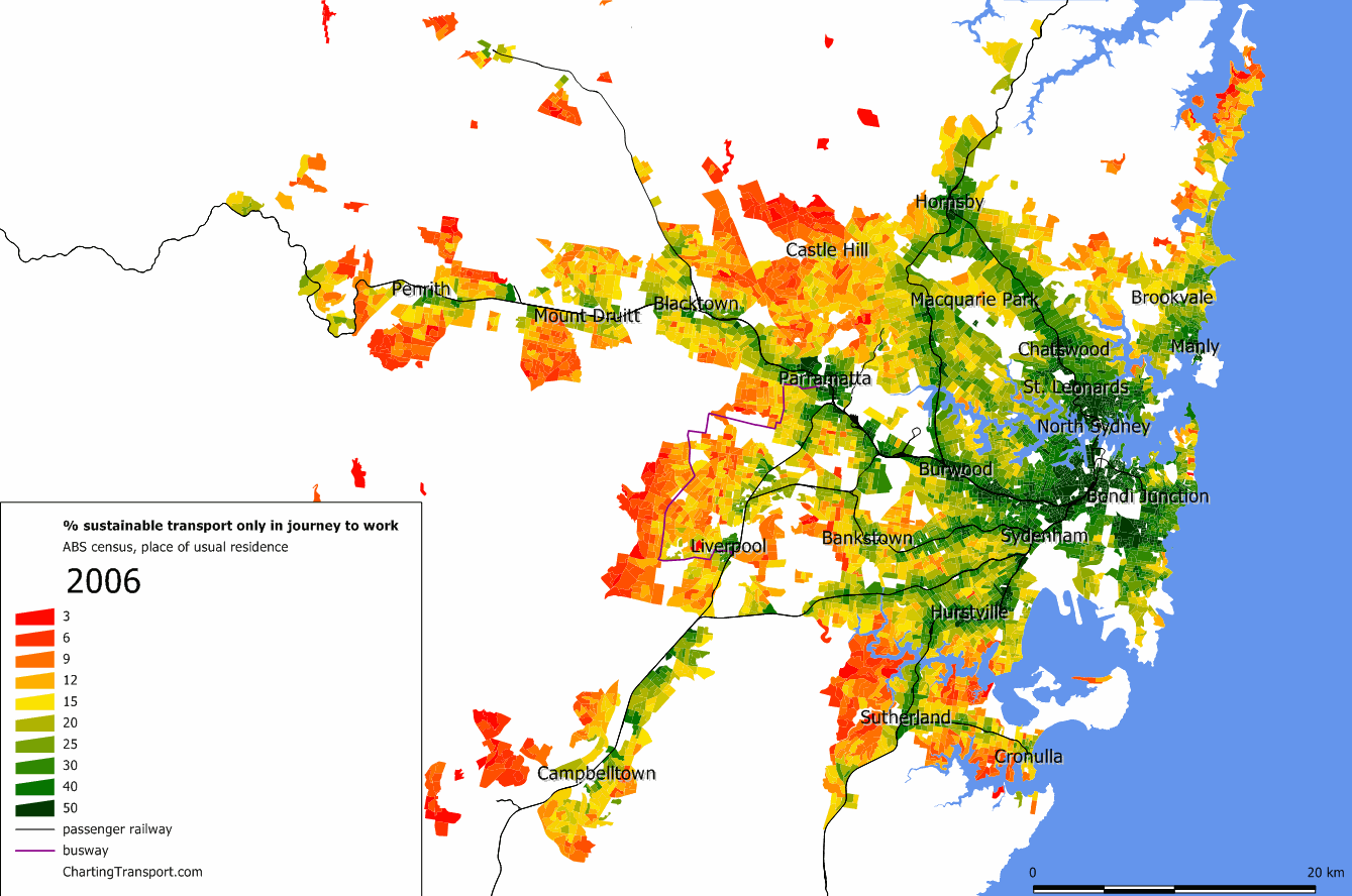 Few people would disagree that higher population densities increase the viability of high frequency public transport services, and enable higher non-car mode shares – all other things being equal. But many (notably including the late Paul Mees) would argue that “density is not destiny” – and that careful design of public and active transport systems is critical to transport outcomes.