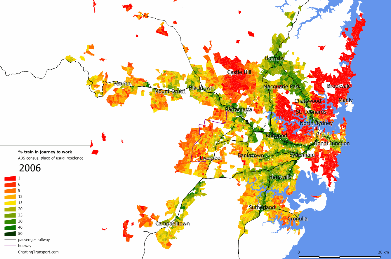 The following maps are all at the same scale both geographically and for density shading. The blue outlines are urban area boundaries, and the black lines represent rail lines (passenger or otherwise, and including some tramways). The density values are in persons per square kilometre (1000 persons per square kilometre = 10 persons per hectare). (Apologies for not having coastlines and for some of the blue labels being difficult to read).