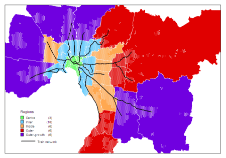 Most of my analysis will deal with six geographic zones – four rings of Melbourne, Geelong and other regional cities in the VISTA sample combined (Ballarat, Bendigo, Shepparton and the Latrobe Valley). Here’s a map of the Melbourne zones: