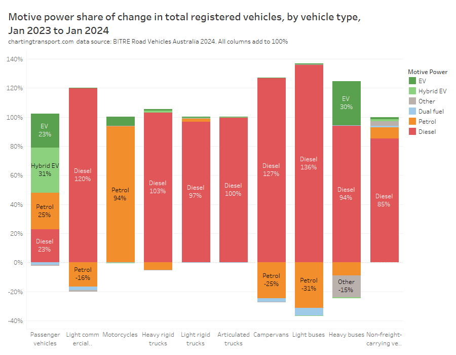Here’s the motive power share of registered vehicles by vehicle type across Australia over the last four years: