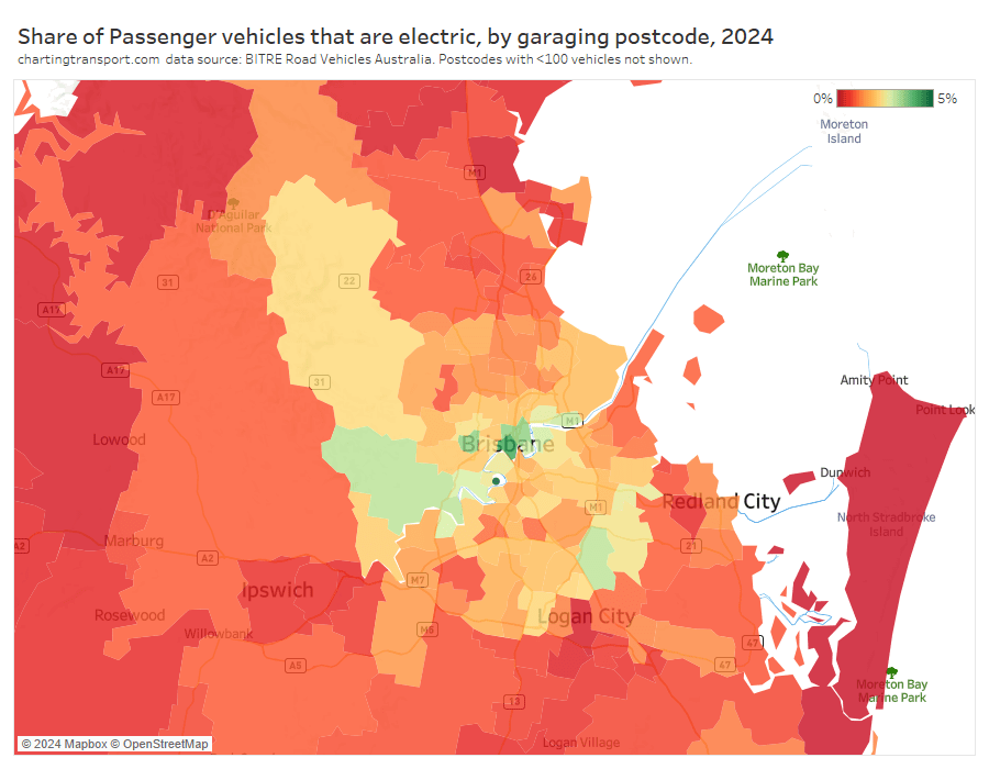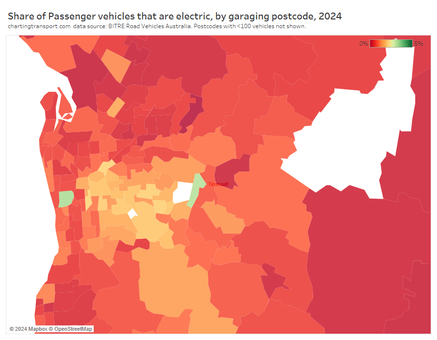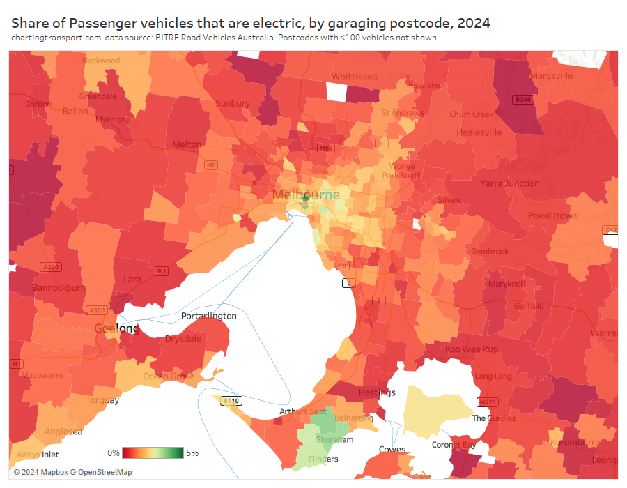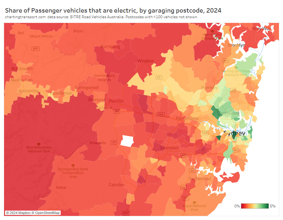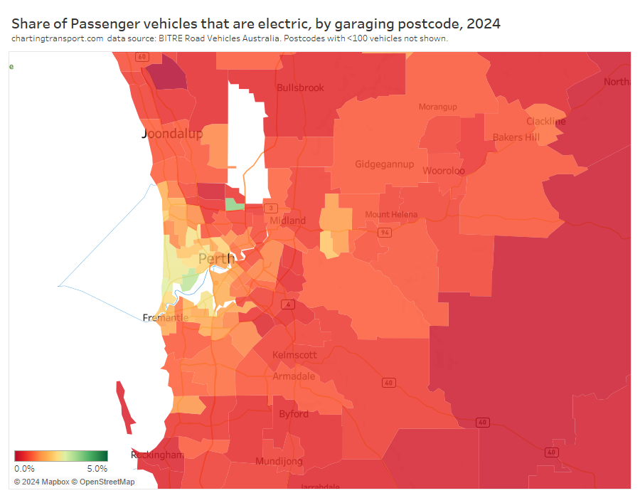BITRE publish data down to postcode level, so it’s easy to calculate the EV share of garaged vehicles by postcode.