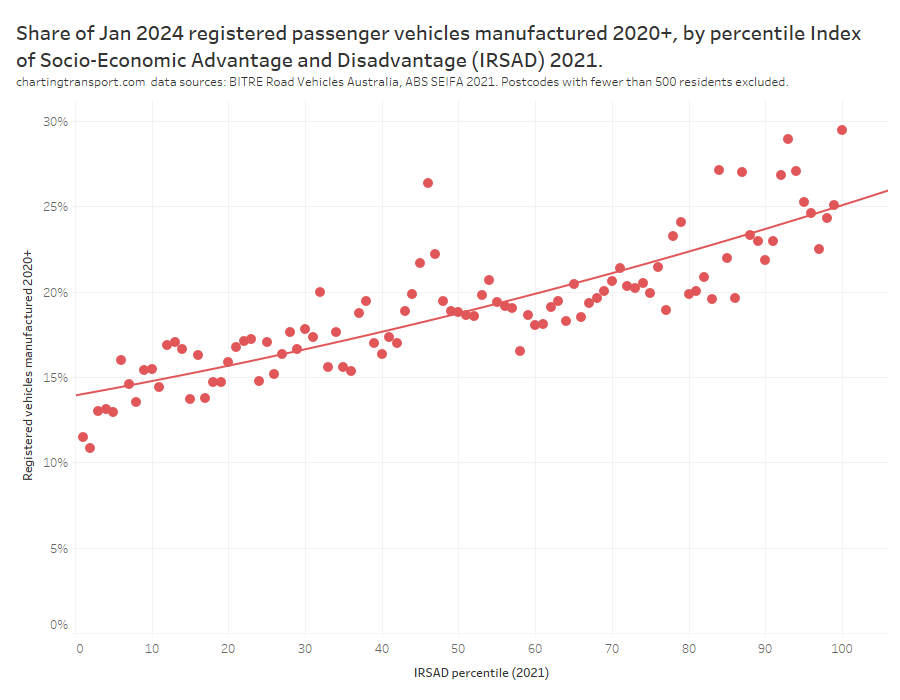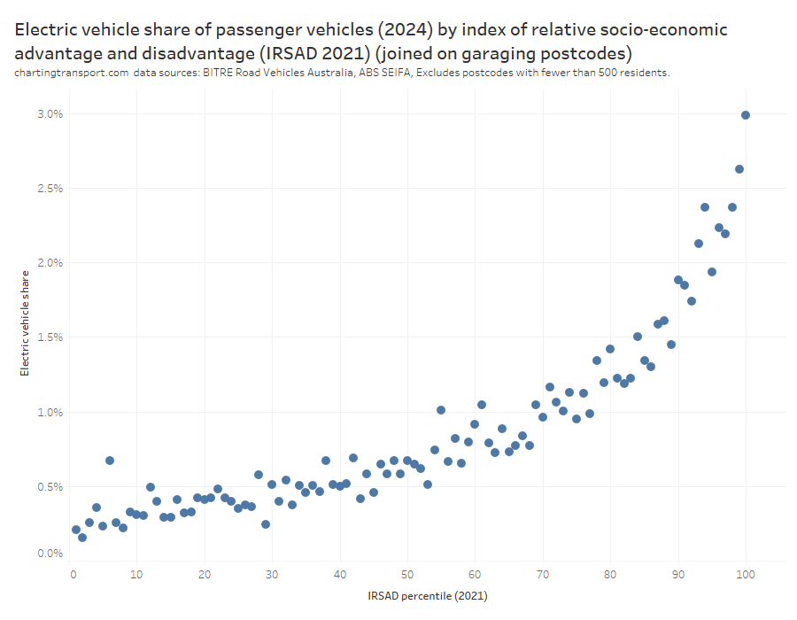 So, yes there is a strong relationship between socio-economic advantage and newness of vehicles, but this is more of a linear relationship (I’ve actually fitted a binomial trend line but it comes out very close to linear). EV share is much higher in the most advantaged areas, even if you were to control for relative newness of vehicles.