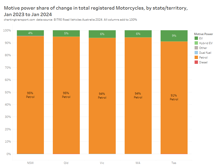 Electric motive power also featured for motorcycles. Here’s the motive power share of net growth in registered motorcycles by state/territory: