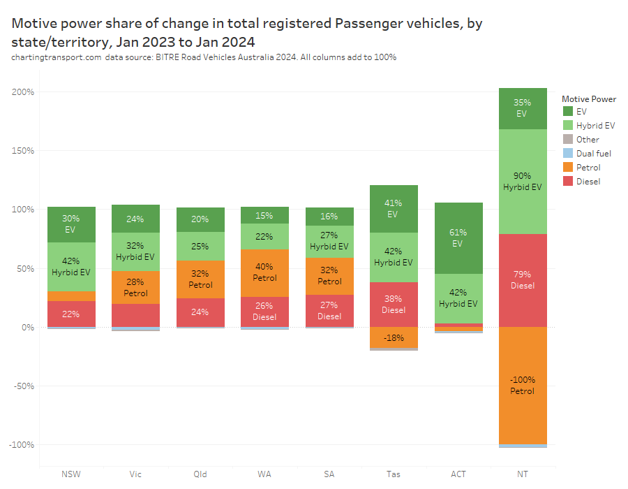 The Northern Territory saw a continuing decline in registered petrol passenger vehicles which makes the chart a little confusing – but the biggest increase there was hybrids.