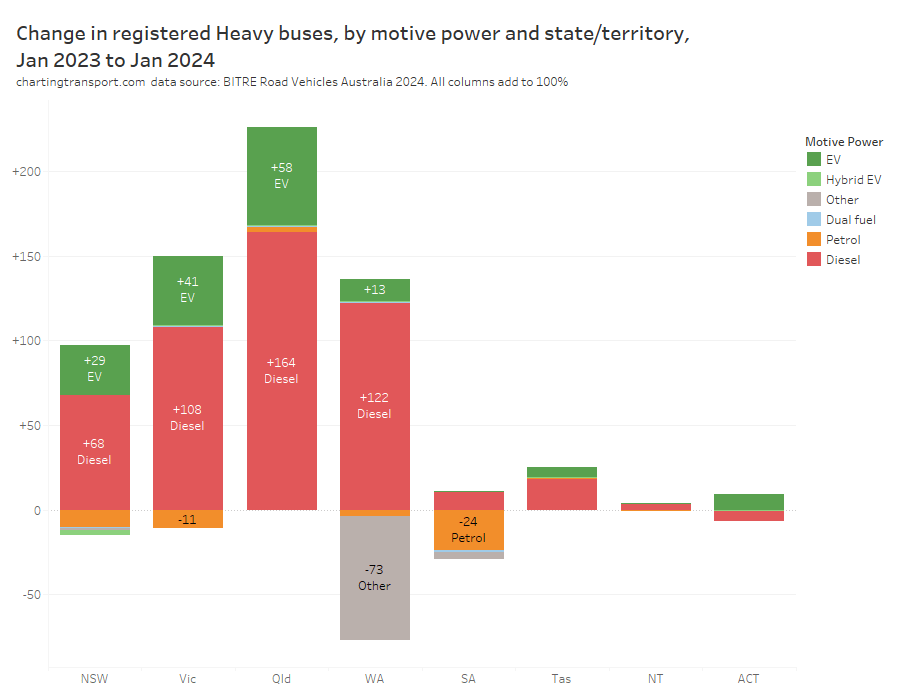 Queensland had the biggest increase in heavy buses overall, and also the biggest increase in electric buses. Victoria had the next largest increase in electric buses followed by NSW. I am guessing the -73 “other” heavy buses in WA might have been gas buses retired and replaced by mostly diesel buses.