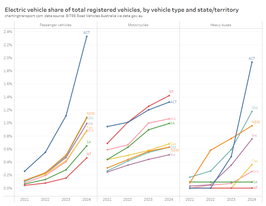 The ACT is leading EV take up for passenger vehicles and heavy buses. It’s population is also almost entirely urban.