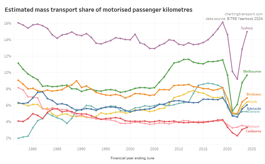 This chart produces some unexpected outliers. Hobart shows up with very high public transport trips per capita in the 1970s, which might be relate to the Tasman Bridge Disaster which severed the bridge between 1975 and 1977 and resulted in significant ferry traffic for a few years (over 7 millions trips in 1976-77). Canberra also shows up with remarkably high trips per capita in the 1980s for a relatively small, low density, car-friendly city, but has been in steady decline since.