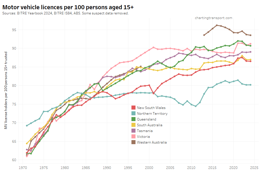 Many age bands exceed 100 (more licence holders than population) and there are some odd kinks in the data around 2015-2017 for all age bands (especially 70-79). I’m not sure that it is plausible that licencing rates of teenagers might have plummeted quite so fast in recent years. I’m inclined to treat all of this ACT data as suspect, and I will therefore exclude the ACT from further charts with state/territory disaggregation.