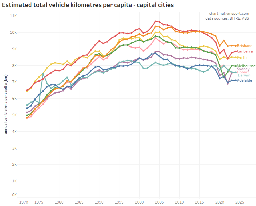Canberra has dramatically reduced vehicle kilometres per capita since around 2014 leaving Brisbane as the top city.