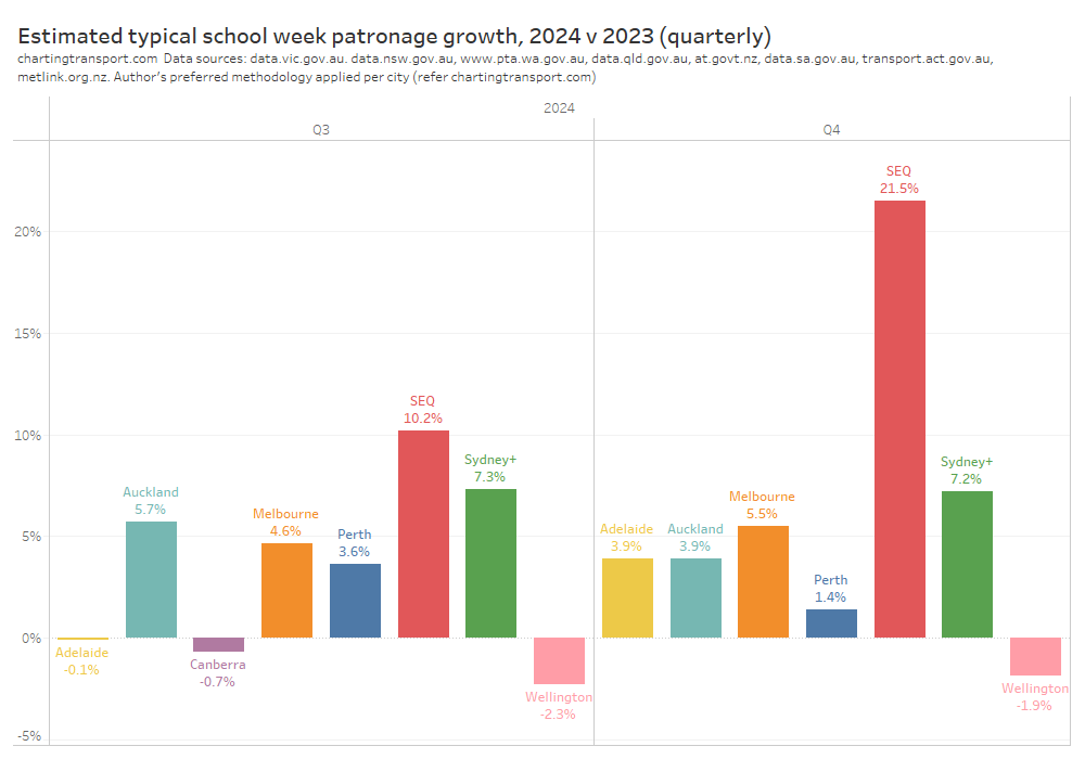 Patronage growth has slowed in most cities, but as of 2024 Q4 was still tracking above population growth in most cities (except Perth and Wellington).