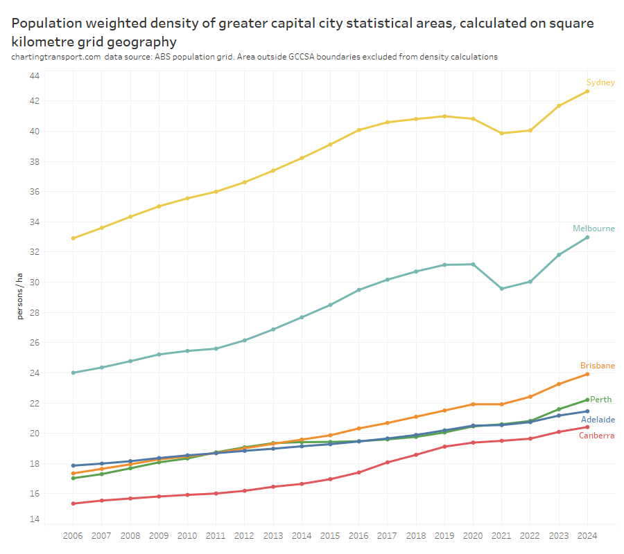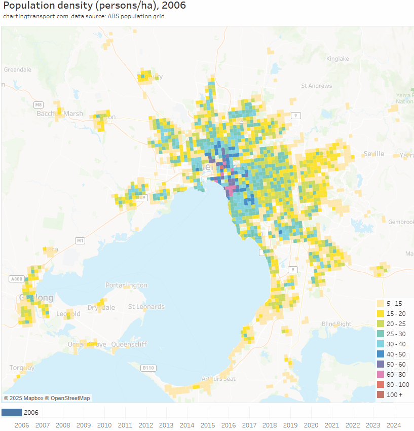 I’ve also created some new animated density maps for each city (2006 to 2024). Here’s Melbourne: