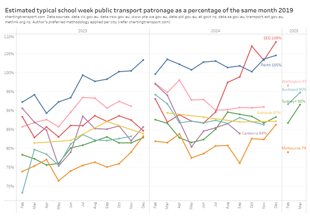 Public transport patronage has risen significantly in South East Queensland (followed a massive fare reduction). Perth is the only other city to have exceeded 2019 patronage levels so far.