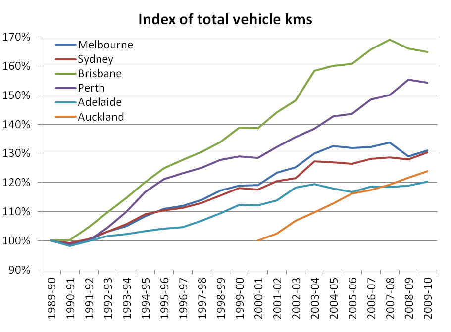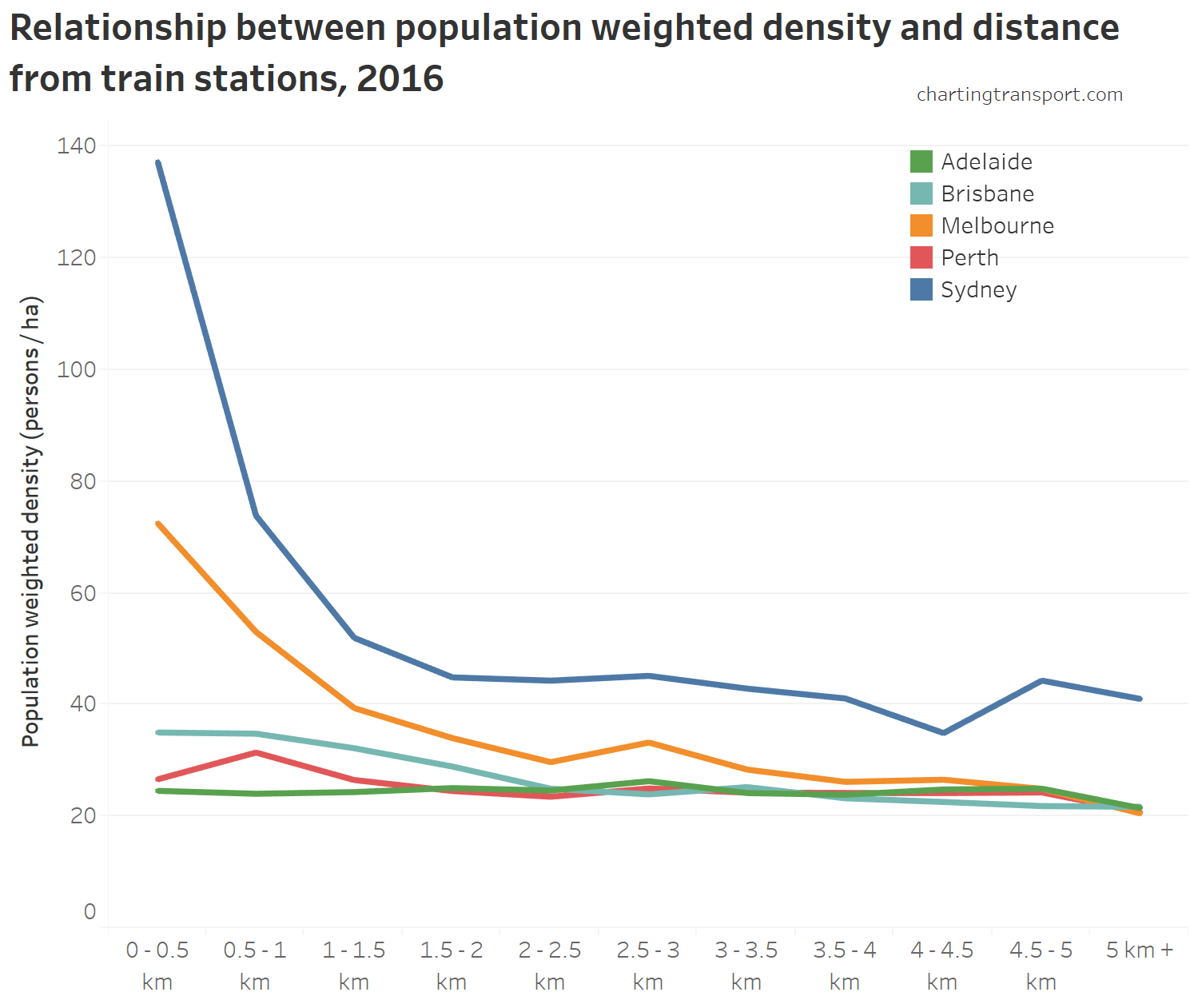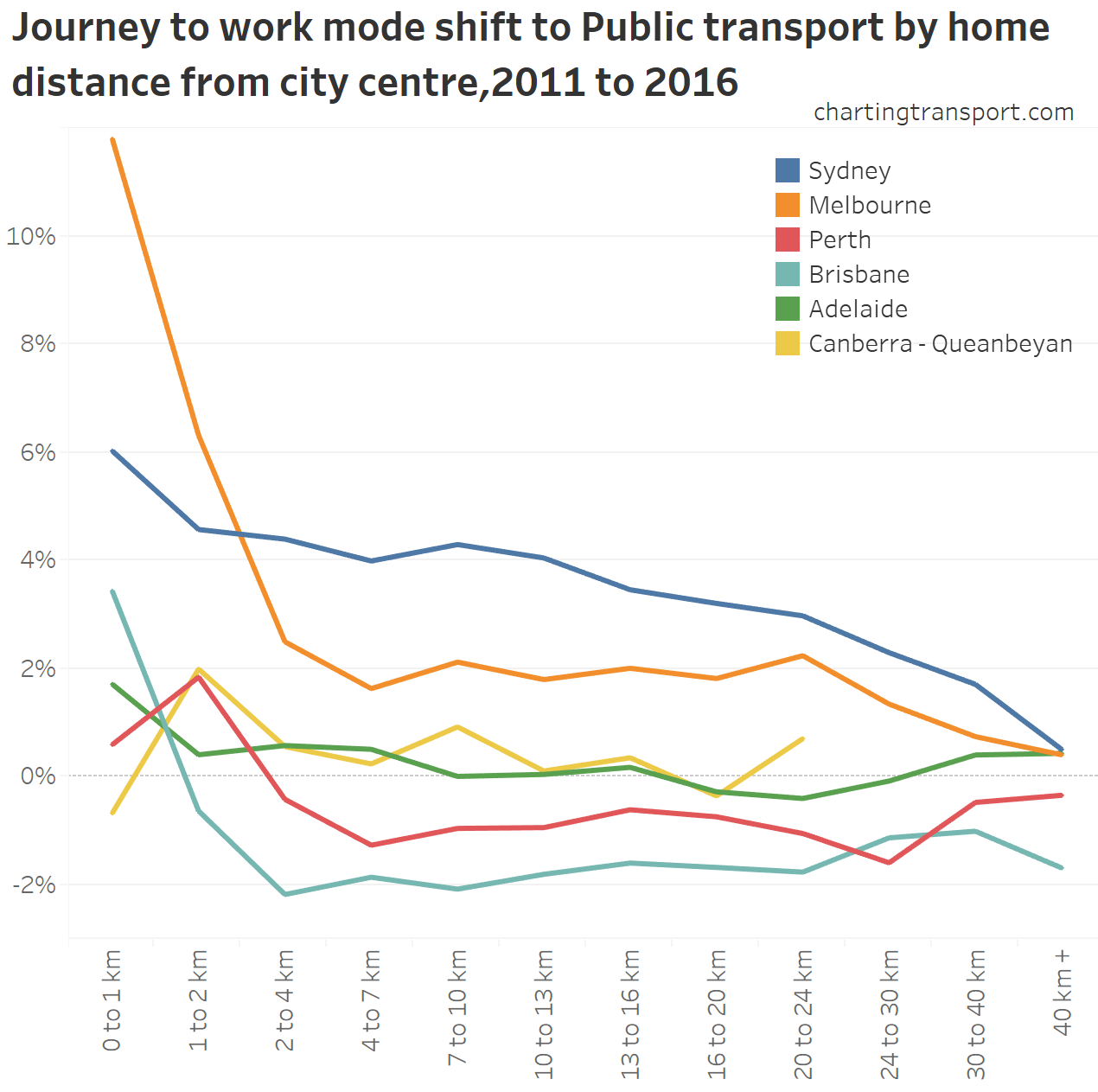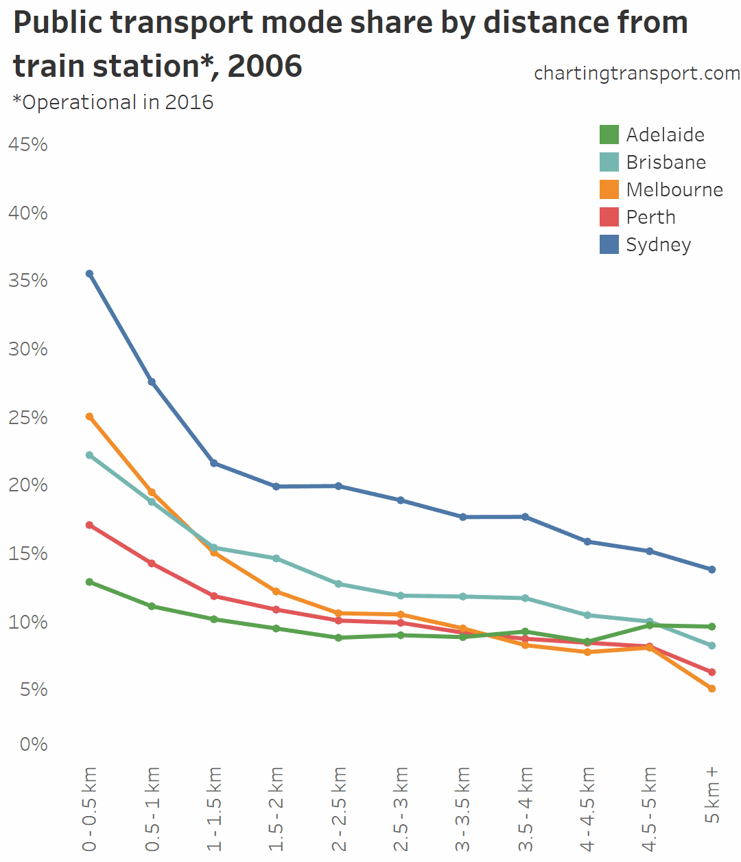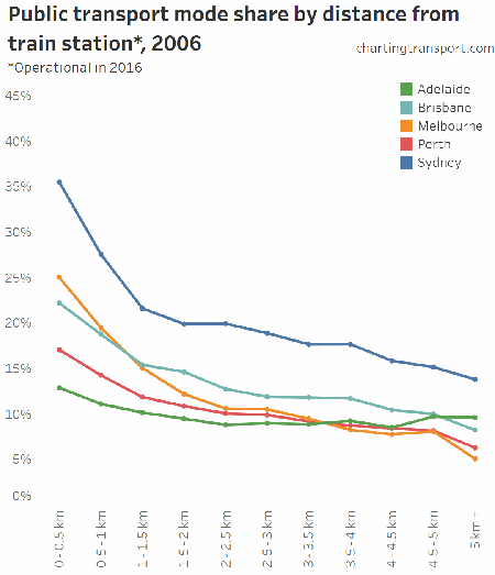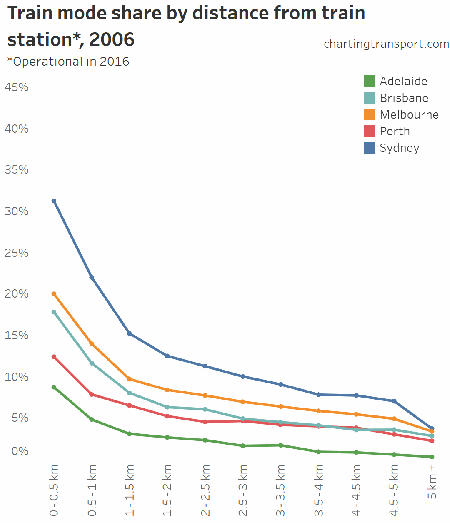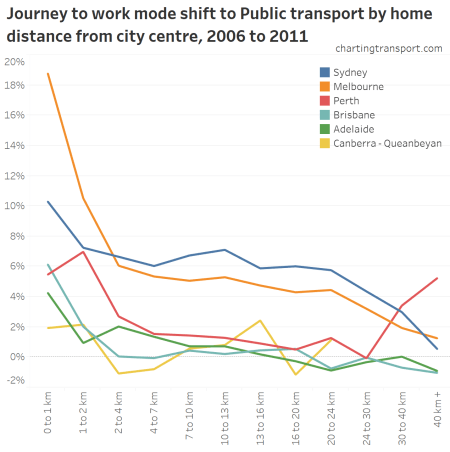 You can see that public transport shares went up between 2006 and 2011 in most cities at all distances from train stations. In both Perth and Brisbane there were new train lines opened between 2006 and 2011, which will explain some of that growth.