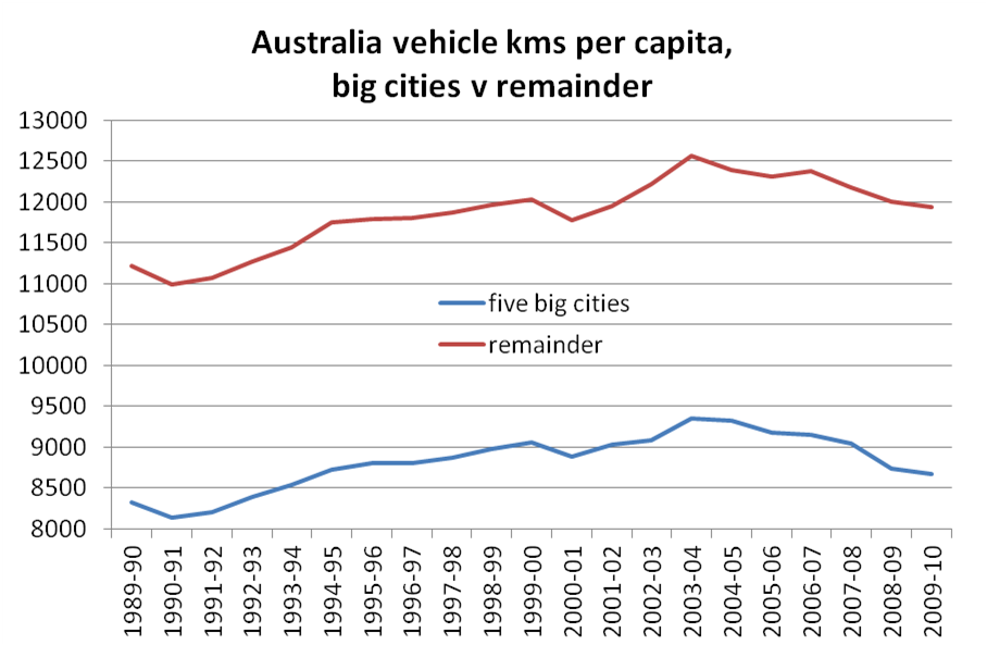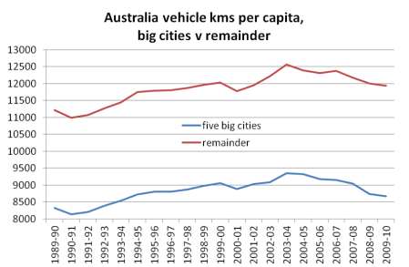 Here’s the same chart for 2006-2011, and you can clearly see the impact of the opening of the Mandurah railway line in Perth with significant mode shift beyond 30 km: