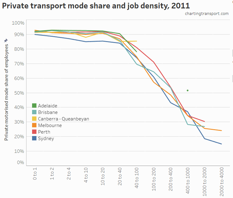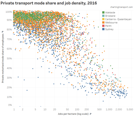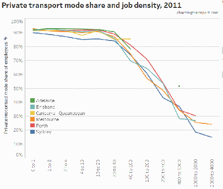 It’s also interesting to see that the blue Sydney dots are generally lower than other cities at all job densities. That is, Sydney generally has lower private transport mode shares than other cities, regardless of employment density.