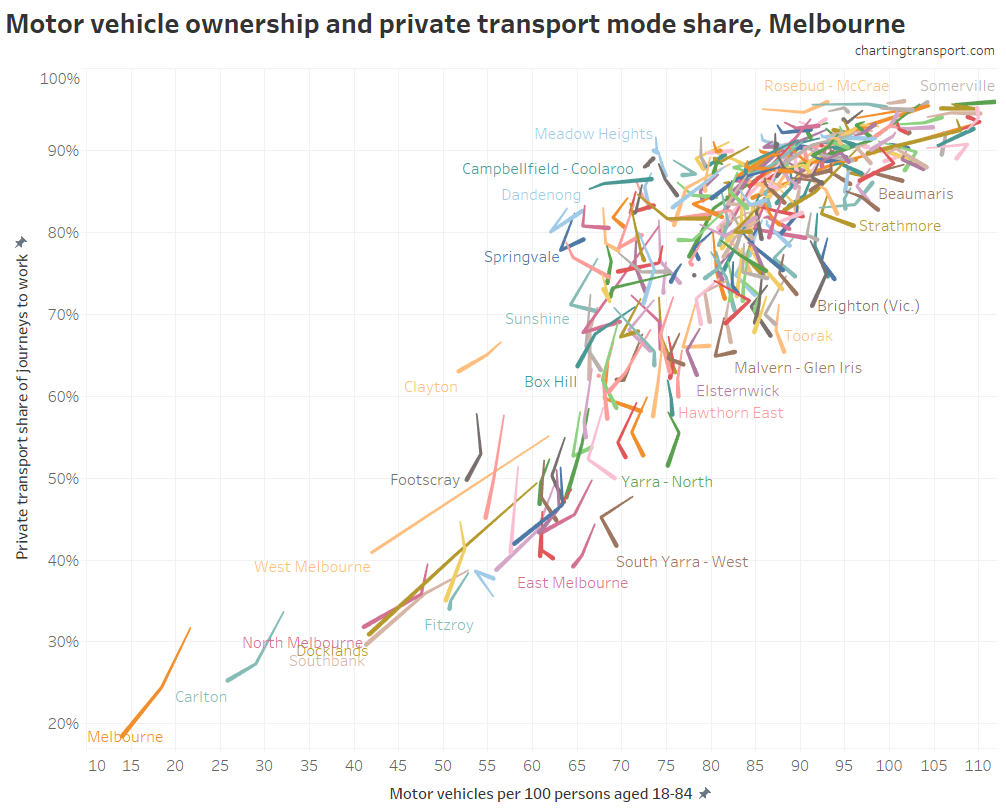 The outliers on the upper left are generally less-wealthy middle-outer suburban areas (lower motor vehicle ownership but high private mode share), while the outliers to the lower-right are wealthy inner suburbs where people can afford to own plenty of motor vehicles, but they didn’t use them all to get to work.