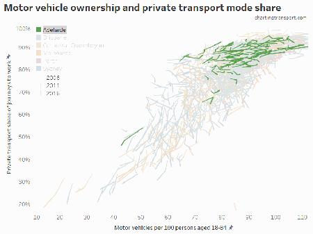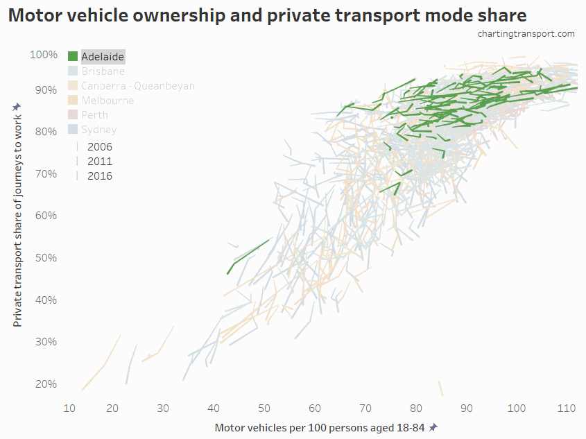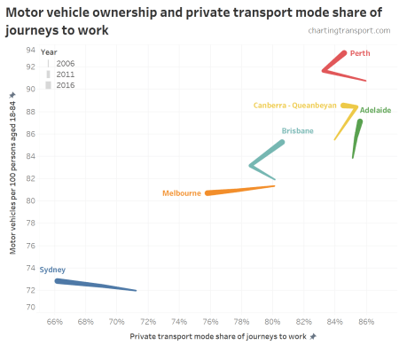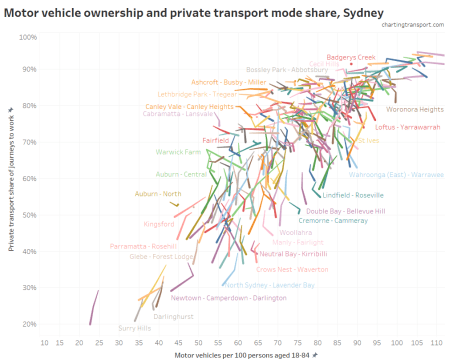 You can see big differences between the cities, but also that Brisbane and Perth have many SA2s with very high private mode share and rapidly increasing motor vehicle ownership (ie moving up and right, although it’s a little difficult to see with so many lines overlapping). Melbourne and Sydney have plenty of SA2s moving down and left – reducing motor vehicle ownership and declining private transport mode share (which may make some planners proud).