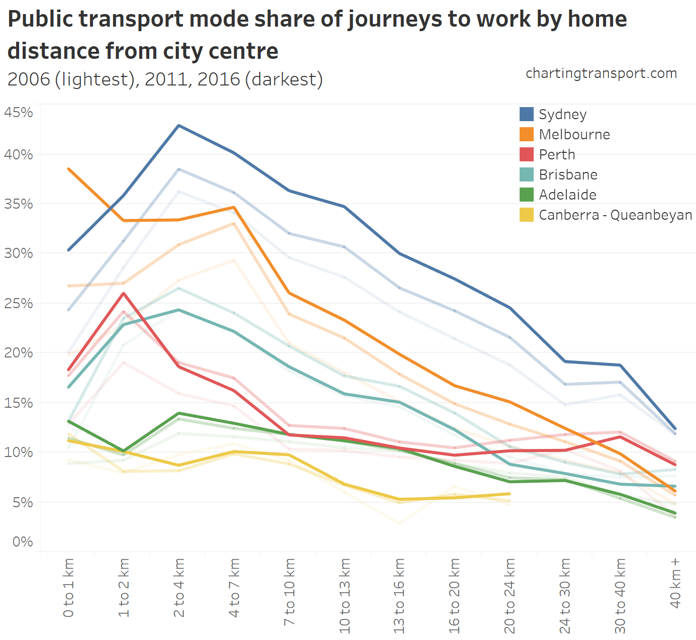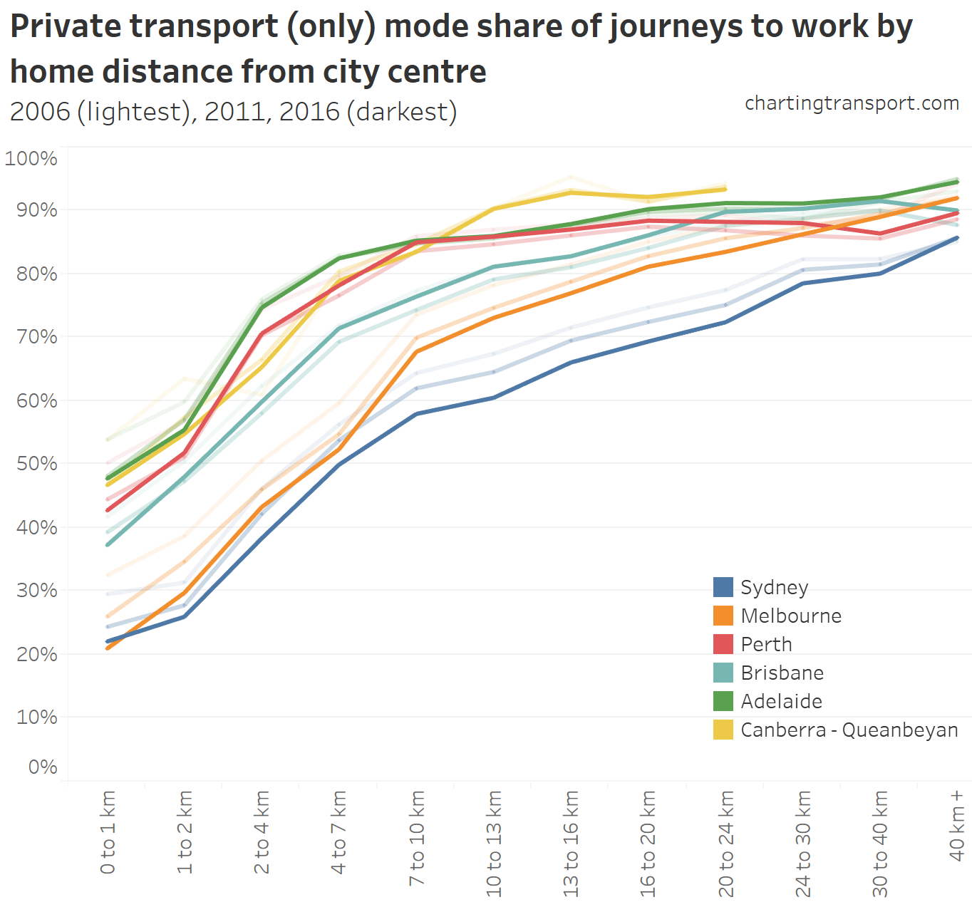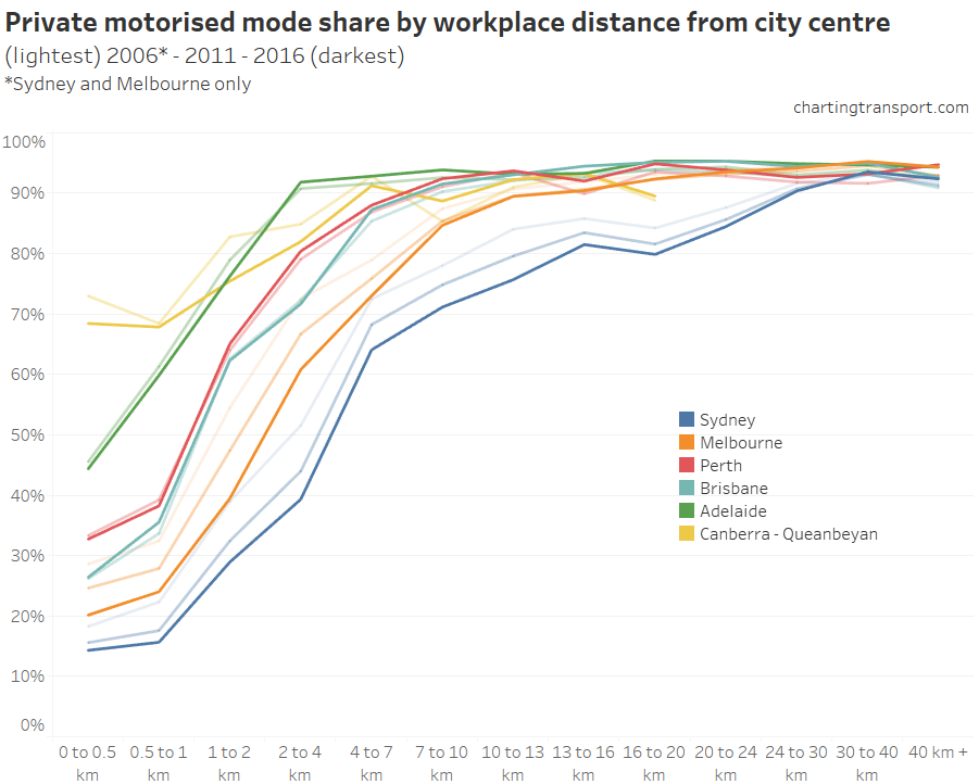 Here is a chart showing private transport mode share by workplace distance from the city centre. I’ve used faded lines to show 2011 and 2006 results (2006 only available for Sydney and Melbourne).