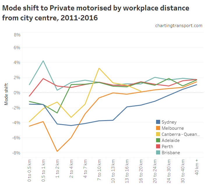 The trends over time are also interesting. Brisbane saw mode shifts towards private transport at all distances more than 2 km from the city centre between 2011 and 2016. However there were not significant shifts for Perth outside the city centre – that is: modes shares by geography didn’t change very much. The mode shift away from public transport in Perth is best explained by the shift in jobs balance away from the city centre.