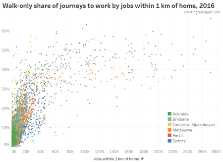 You don’t have to have a lot of nearby jobs to get a higher walking mode share, but if you do, you are very likely to get a high walking more share. The exceptions (many jobs, but low walking share) include many parts of Parramatta (Sydney), and areas separated from nearby jobs by water bodies or other topographical barriers (eg Kangaroo Point in Brisbane).