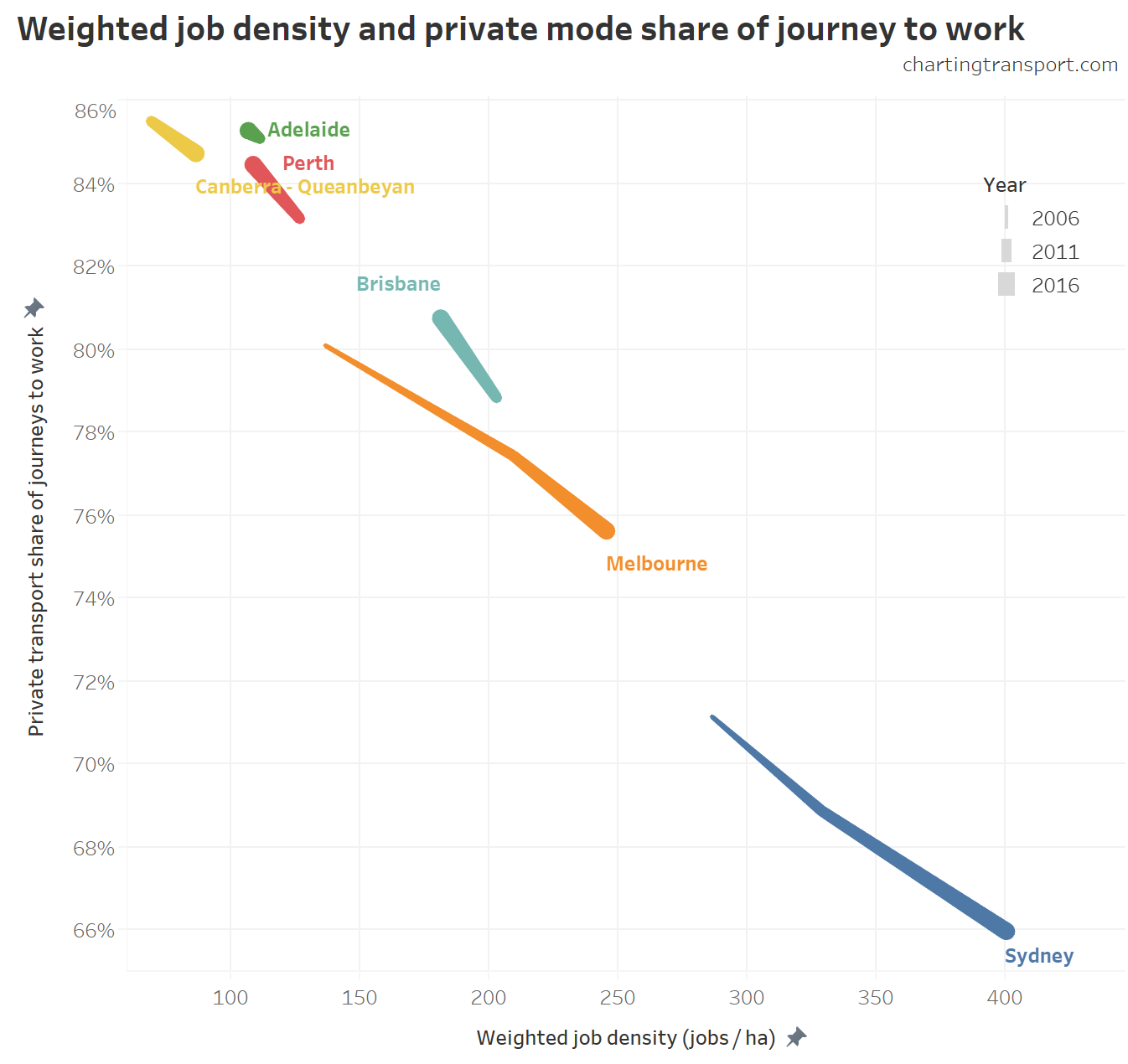 Which leads us to the next view: the private transport mode shares for jobs in different density ranges in each city for 2011 and 2016.
