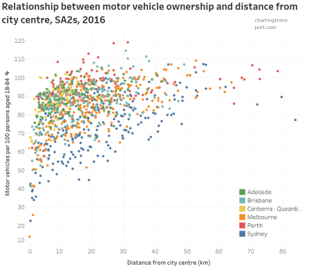 In the bottom left of the chart are inner city SA2s with declining private mode share and declining motor vehicle ownership. For motor vehicle ownership rates around 70-80 (motor vehicles per persons aged 18-84), there are many SA2s with private mode shares that declined 2006 to 2016, but not significantly lowering motor vehicle ownership rates. That suggests that just because people own many motor vehicles, they don’t necessarily use them to drive them to work.