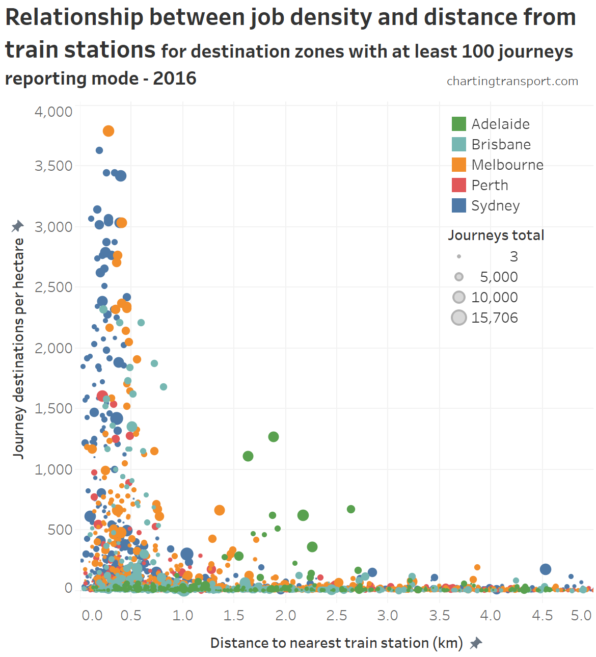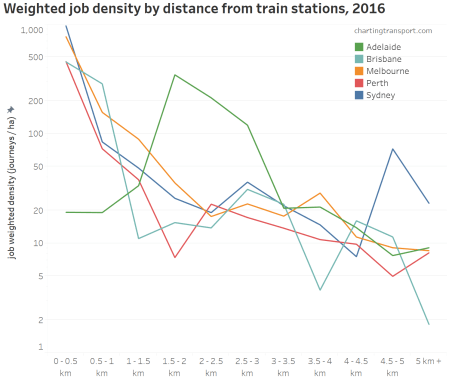 In most cities, destination zones with high jobs density (over 700 jobs/ha) were only found within 1 km of a train station – with the notable major exception of Adelaide (again!).