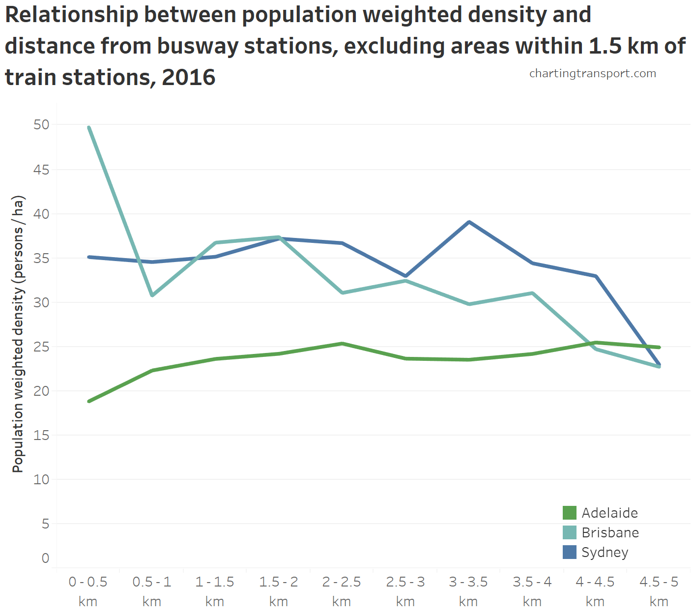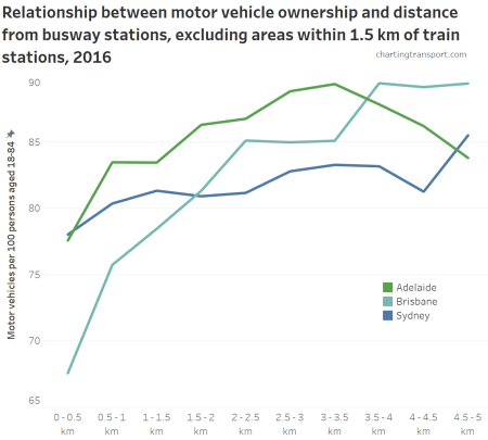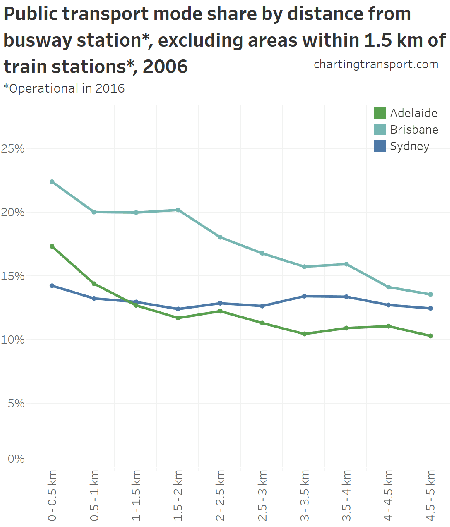 Curiously, public transport mode shares were higher in places between 3 and 5 km from busway stations in Sydney, compared to immediately adjacent areas. I’m not sure that I can explain that easily, but it suggests equally attractive public transport options exist away from busway and train stations.
