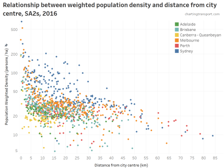 In case you are wondering about the Brisbane SA2 with low density and low private transport mode share (middle left of chart) it is the Redland Islands where car-carrying ferries are essential to get off an island, and are counted as public transport in my methodology. The Canberra outlier in the bottom left is Acton (which is dominated by the Australian National University).
