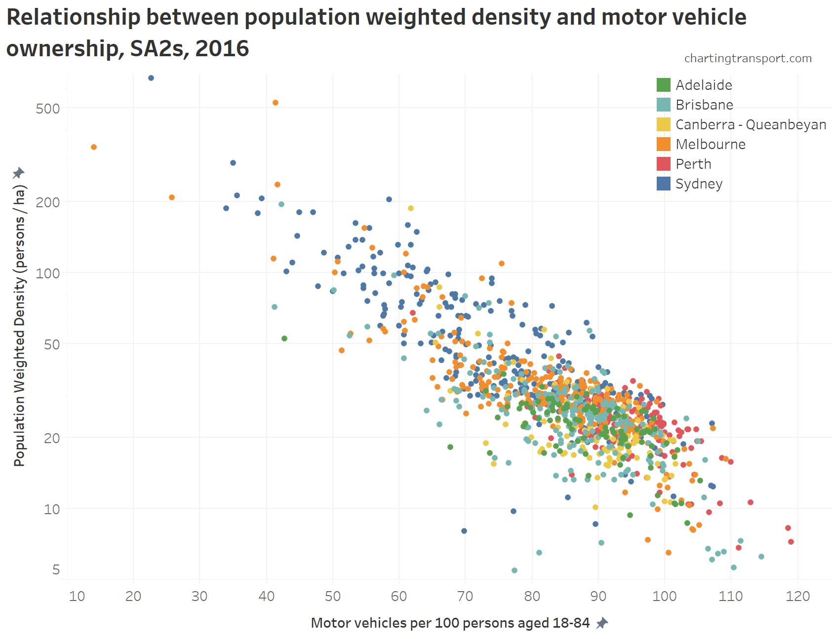 But Canberra does have higher active transport mode share, so it’s worth doing the same analysis with private transport mode shares: