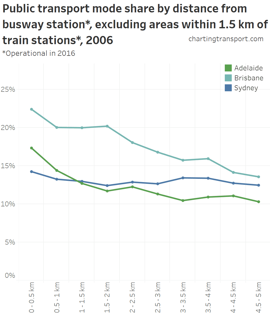 Busways are the other major form of rapid transit in Australian cities, with major lines in Brisbane, Sydney and Adelaide. Here is a chart of public transport mode share by distance from busway stations, excluding areas also within 1.5 km of a train station: