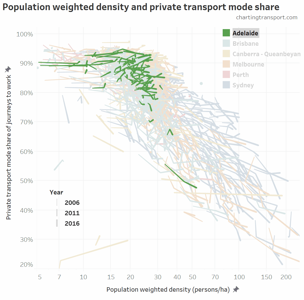 The relationship is very strong for Melbourne and Sydney over time. Between 2011 and 2016, Perth and Brisbane saw increased population density but reduced public transport mode share (mostly because of changes in the distribution of jobs between the centre and the suburbs).