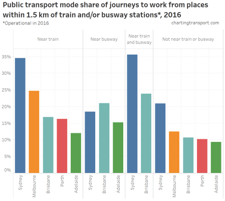 Also of note in this chart is that for areas more than 1.5 km from a train or busway station, Sydney had a much higher public transport mode share compared to the other cities. These areas will be served mostly by on-road buses, but also some ferries and one light rail line. Adelaide has the least difference between mode share for areas near and not-near train or busway stations.