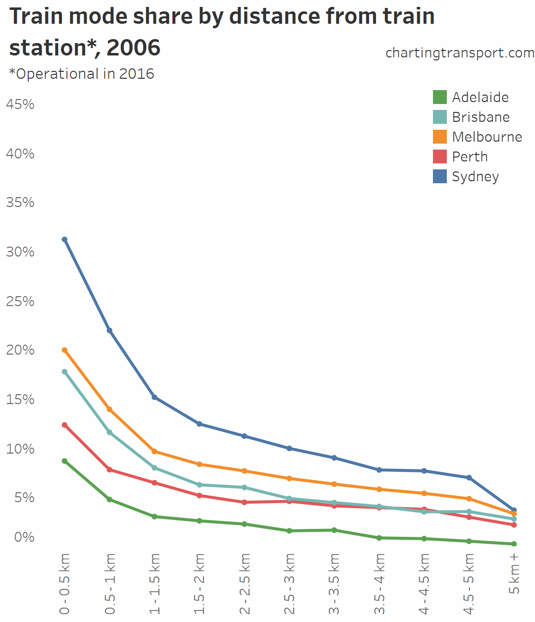 Technical note: A limitation here is that I’ve measured all census years against train stations that were operational in 2016 – so the 2006 and 2011 mode shares will be under-stated for the operational stations of those years. For example, in Melbourne the following stations opened between 2011 and 2016: Williams Landing, South Morang, Lynbrook, and Cardinia Road.